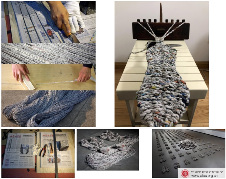 王雷认真整理优化创作中的各个环节:调查、采风、收集、整理、裁切、粘接、打水、搓线、编织、展示等十几个步骤。特别是在材料的选择上考虑到纸的属性及《解放军报》的属性,他认真地说:“同样一张纸,由于其承载的信息不同,它所具有的属性就会带来不同的性质。对材料属性的思考提示着我对作品观念的思考:准确选择材料的属性才是准确表达作品观念的前提。《解放军报》的运用让材料的属性得到了‘智慧’性的发挥,也给作品增加了更多的社会属性。材料、技术、形式、观念在作品中反复交织,让作品的思考空间得到了进一步的拓展。”