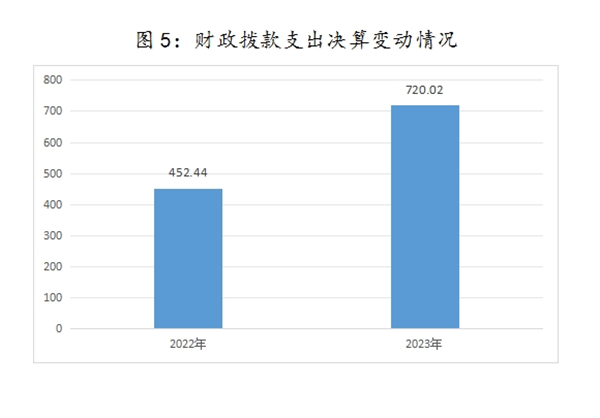2023年度财政拨款支出720.02万元,占本年支出合计的63.9%。与2022年度相比,财政拨款支出增加267.58万元,增长59.14%,主要原因是安排使用上年结转,教育支出(类)培训支出(款)增加。