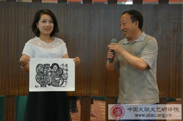 刘宏祥(右)在地县7期研修班上代表全体学员向研修院赠送他的版画作品