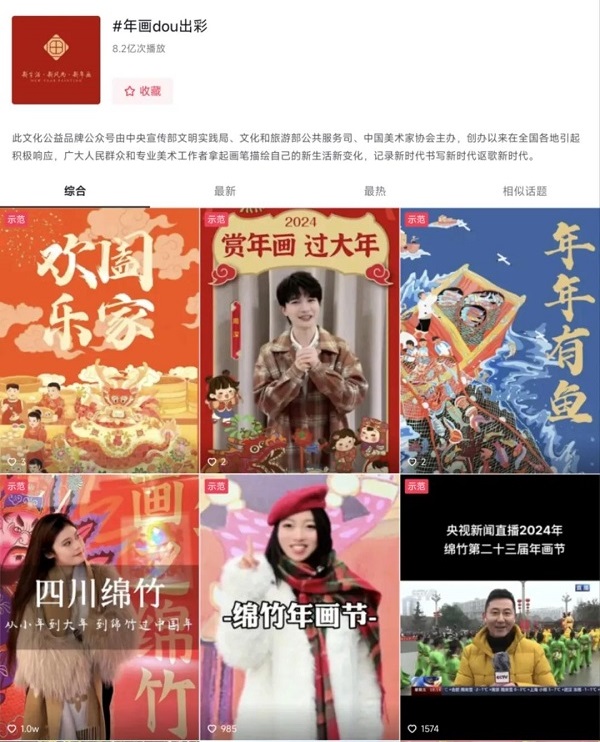 本次展览大胆尝试跨界融合,综合运用多种传播方式。在线上,充分利用了短视频平台传播优势,如抖音上的“#年画dou出彩”话题播放量高达8.2亿次;又如与中央电视台联动,在全国城市地标大屏上轮播“赏年画过大年”宣传语,播出《年画画年》纪录片等;此外,QQ、微博等社交平台也成为传播年画文化的重要阵地。线上展览共获得了1,298,425次的浏览量和73,405个点赞量。这些数字背后,代表着越来越多的人开始关注和喜爱年画。
